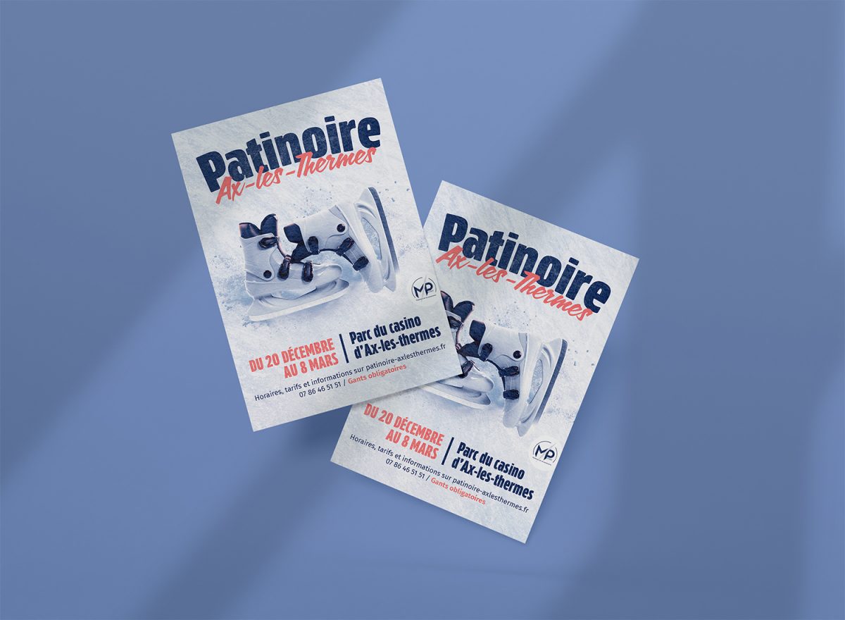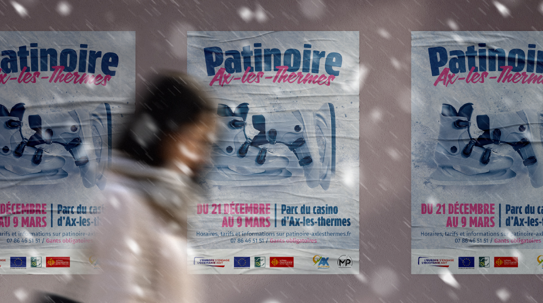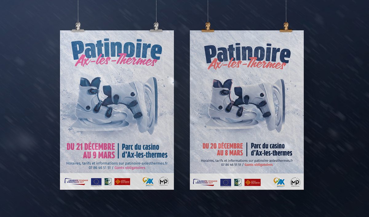 Pour la deuxième année consécutive, j’ai eu le plaisir de concevoir l’affiche officielle de la patinoire d’Ax-les-Thermes, dans le cadre de mon alternance chez l’Agence Sur-Mesure. Ce visuel, décliné en affiches, flyers et bâches, habille la ville tout au long de la saison hivernale.
